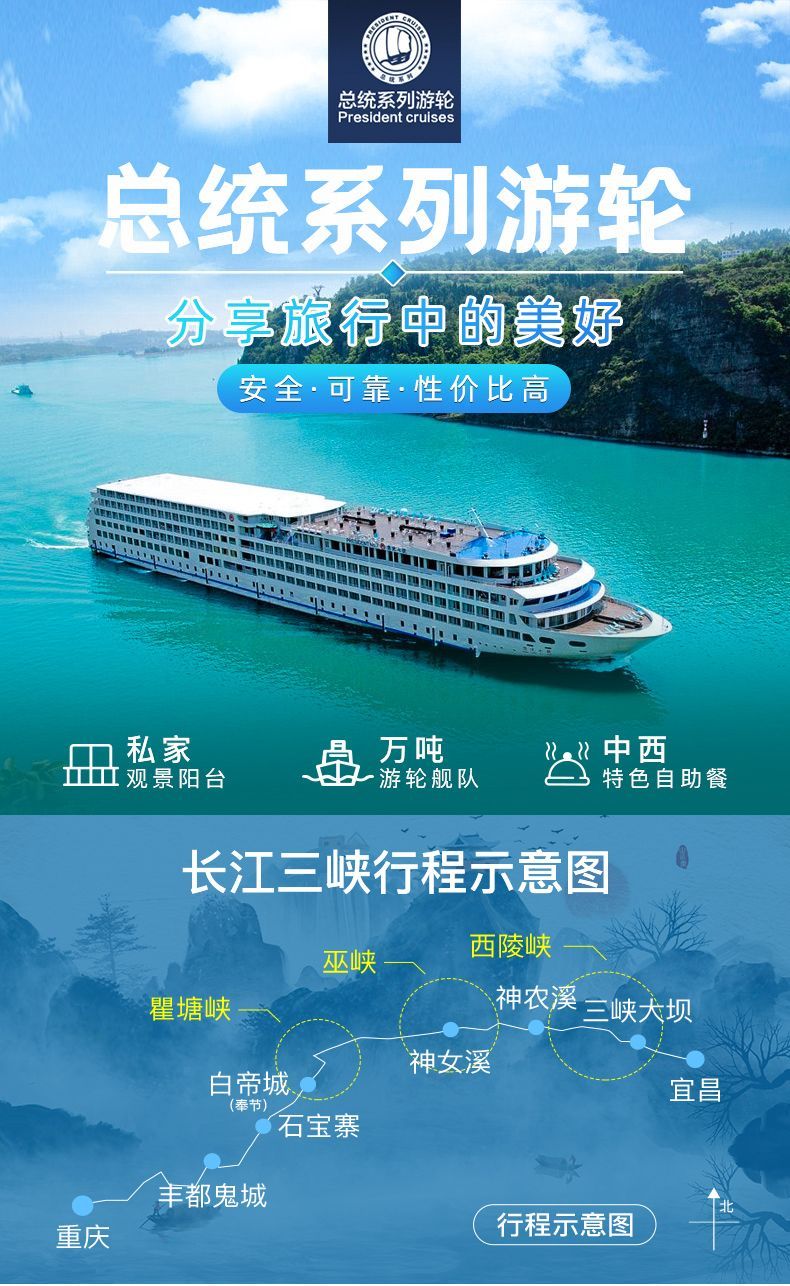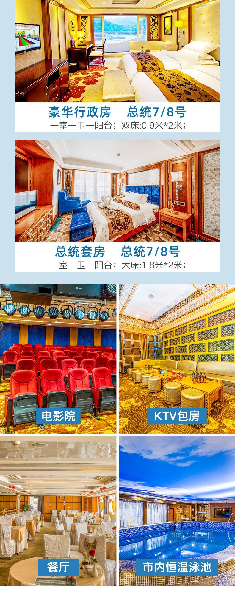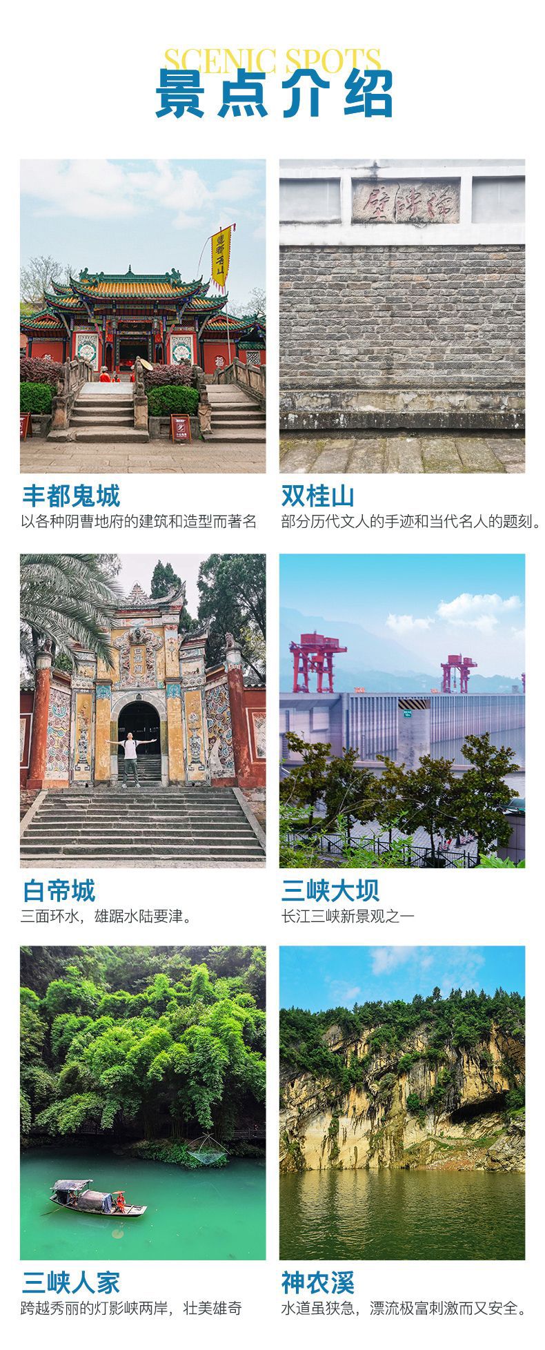 4、自费景点:三峡人家 290 元/人,升船机 290 元/人,白帝城 290 元/人,丰都鬼城290元/人(自费景点船方选择性停靠,不参加的客人在船上休息,不能下船)