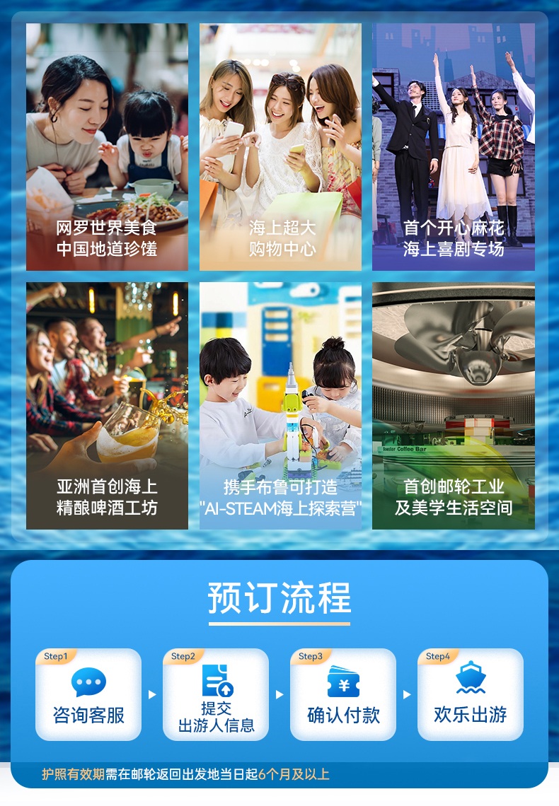 配备全球5G邮轮+亚洲首个AI-STEAM海上探索营,15+匠心美食餐厅,23+沉浸式娱乐设施,海上购物中心