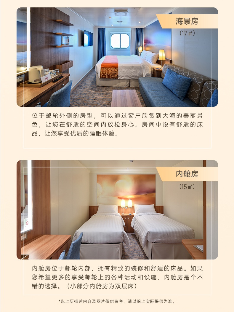 1、邮轮小费:内舱房/海景房/阳台 130 港币每人每晚;